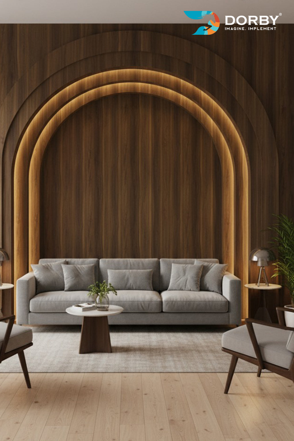 Modern Living Room with Arched Wooden Wall Design