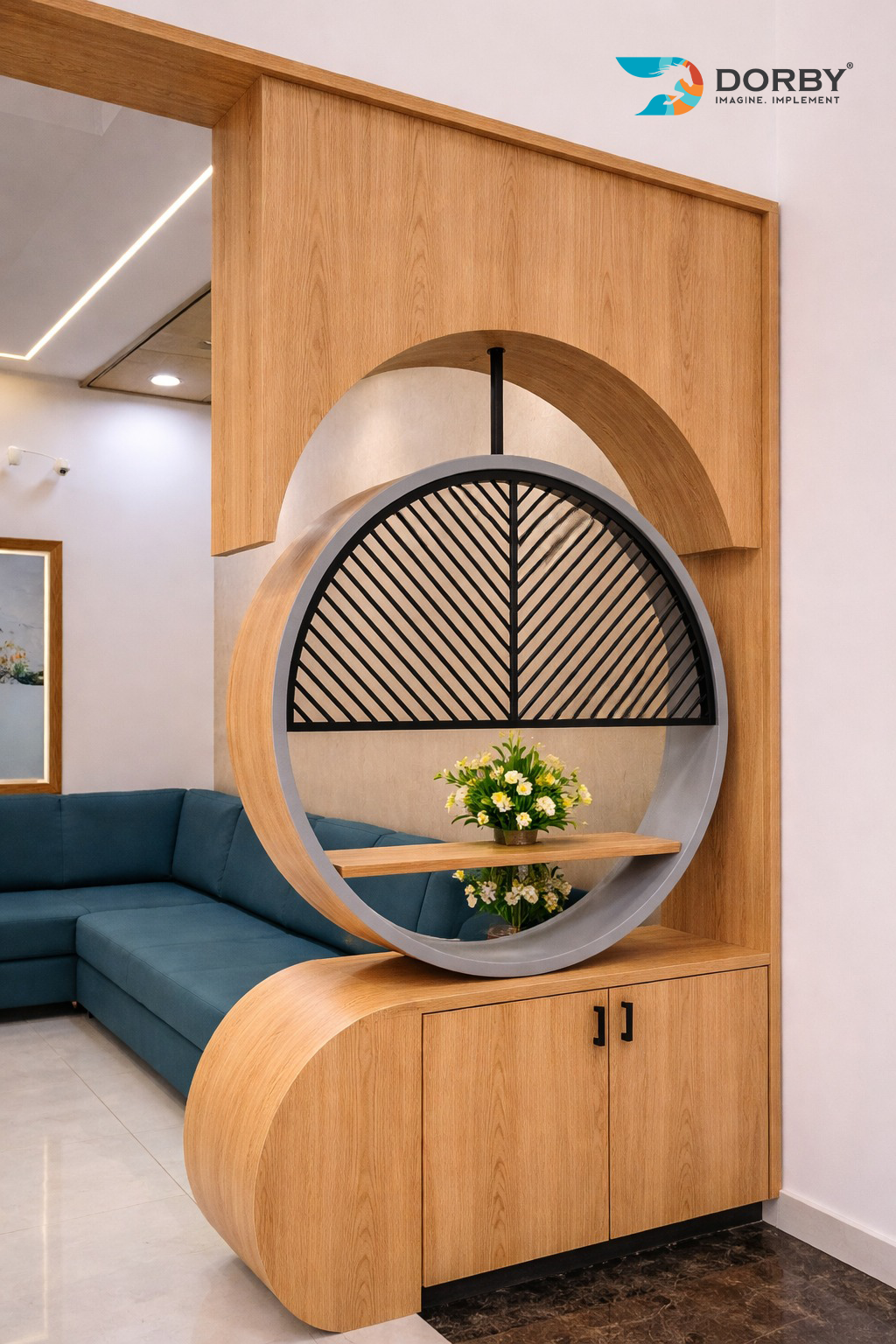 Warm Wood Living Corner with Curved Console